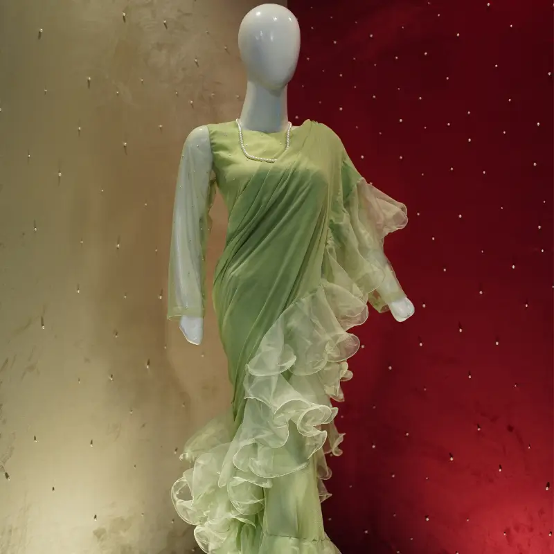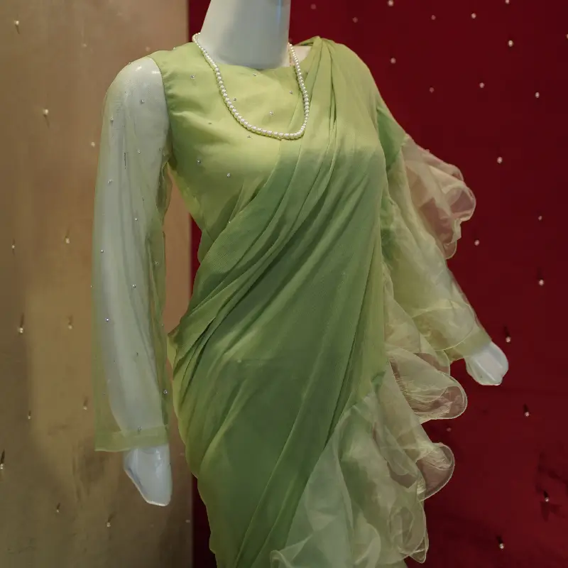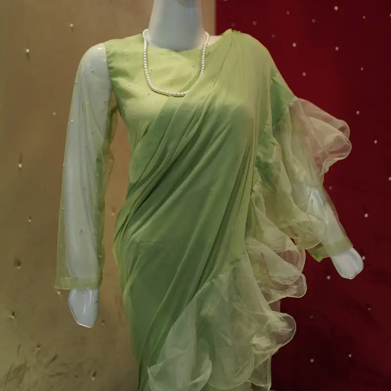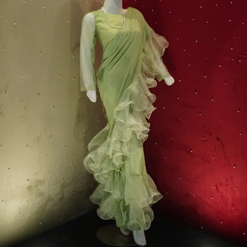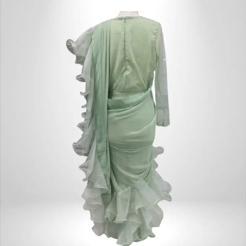 This stunning pastel green saree gown is a perfect blend of traditional elegance and modern sophistication. The outfit features a beautifully draped saree silhouette with cascading ruffle details along the borders, adding a voluminous and dynamic flair. The gown is designed with sheer full-length sleeves, complementing the delicate and ethereal look. Crafted from a combination of chiffon and sheer organza, the fabric enhances the graceful draping while ensuring a lightweight, flowy feel. The subtle pearl embellishments and the soft pastel shade make this ensemble ideal for formal occasions, evening receptions, or festive celebrations. A timeless statement piece, this saree gown effortlessly combines charm and elegance.